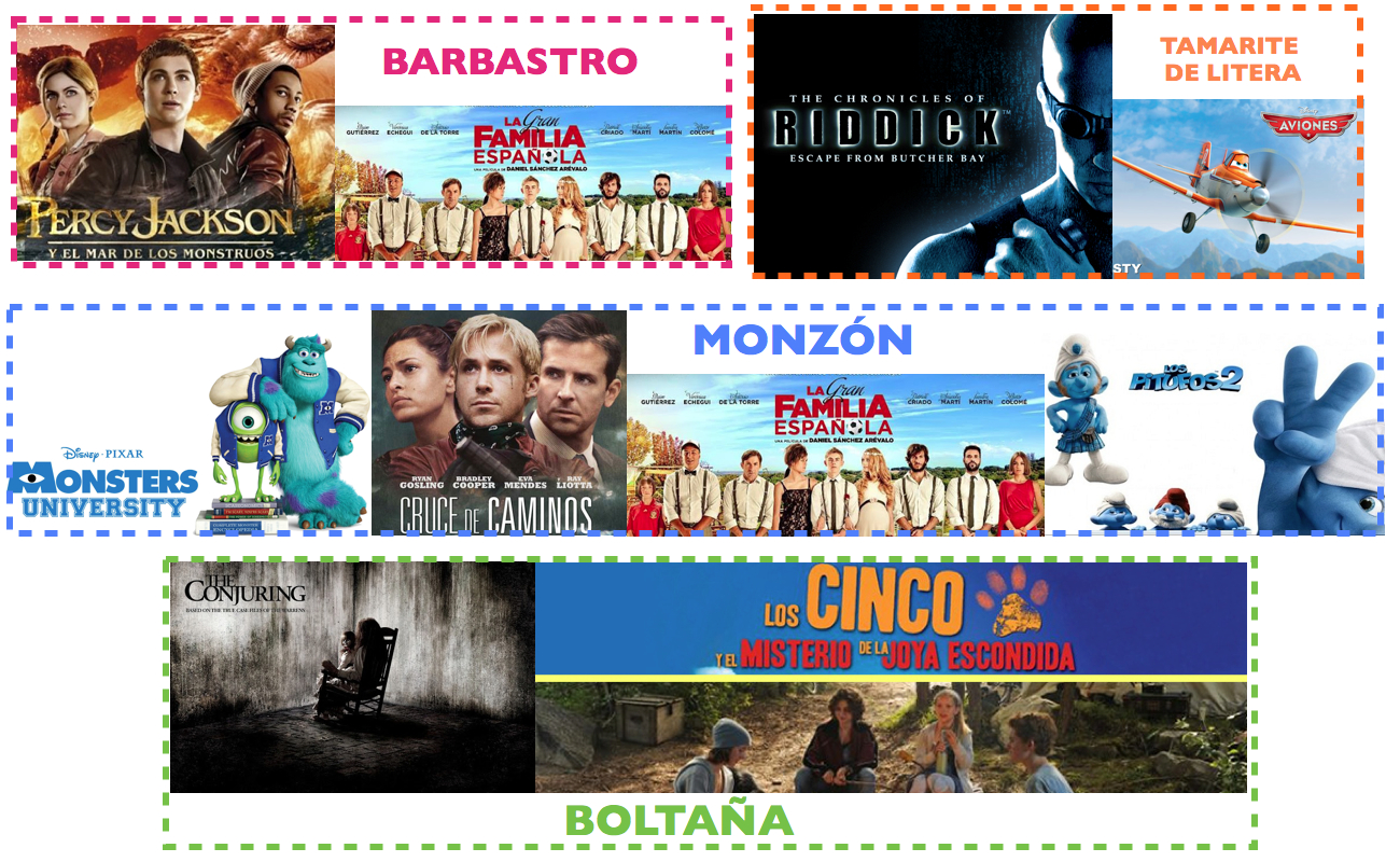 MONZÓN: (Precios reducidos por las fiestas patronales). "La gran familia española": Sábado 21, 22.30 h.; Domingo 22, 19.30 h.; y Lunes 23 (día del espectador) 22 h.. "Monstruos University": Domingo 22, 17 h. (3D). "Cruce de caminos": Viernes 20, 19.30h., y 22.30 h.; Sábado 21, 19.30 h., y 22.30 h.; Domingo 22, 19.30 h.; y Lunes 23 (día del espectador) 22 h.. "Los pitufos 2": Domingo 22, 17 h..